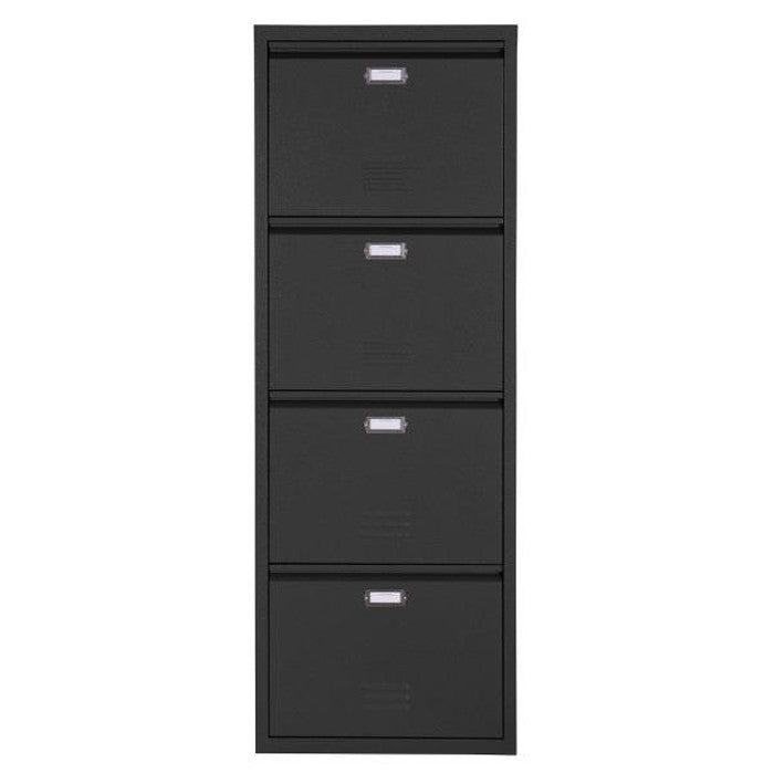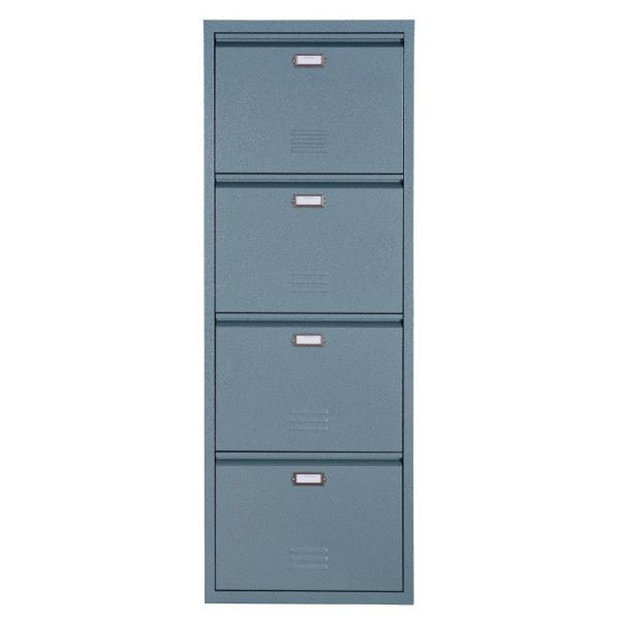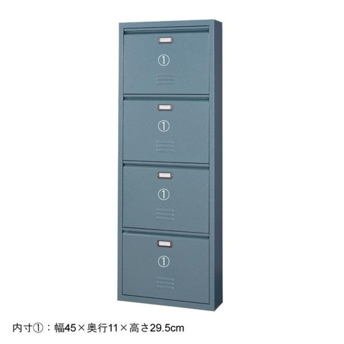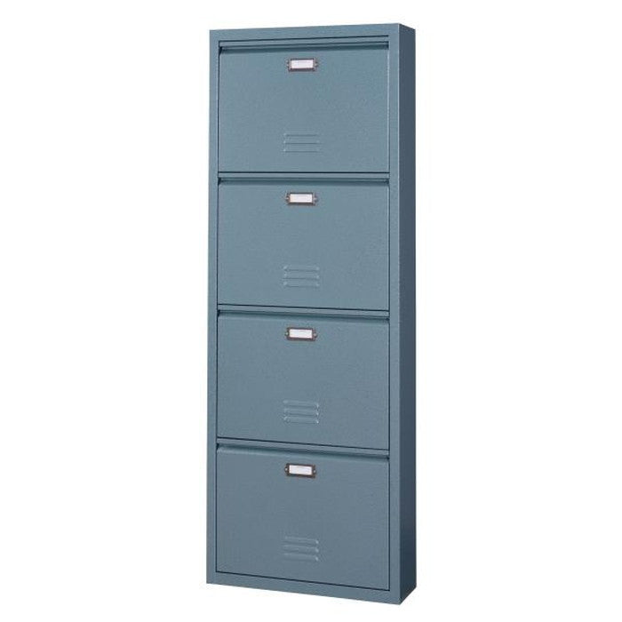 「ラルド シューズラック4D」はロッカーをイメージしたデザインが特徴です。ネームプレートやルーバーカットの細部までこだわったディテールは、おしゃれなだけでなく実用性も考慮されています。スチール製で丈夫な粉体塗装仕上げはハンマートーンという独特の質感で、高級感と耐久性を両立しています。