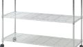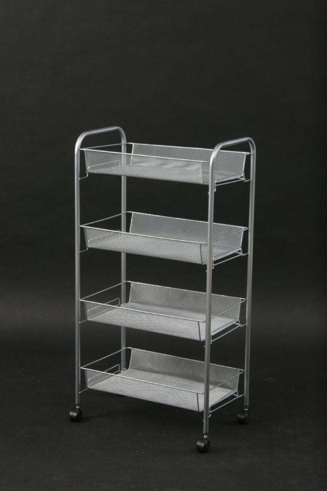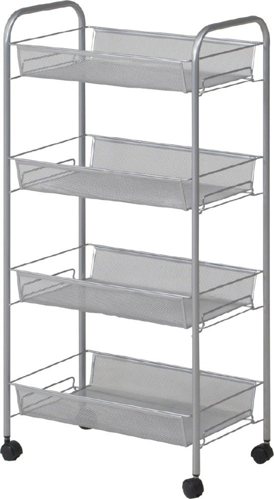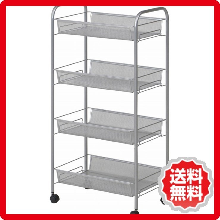 シルバーのメッシュ4段ワゴントローリー|店舗やオフィスで使いやすいキャスター付き収納|fj-69293