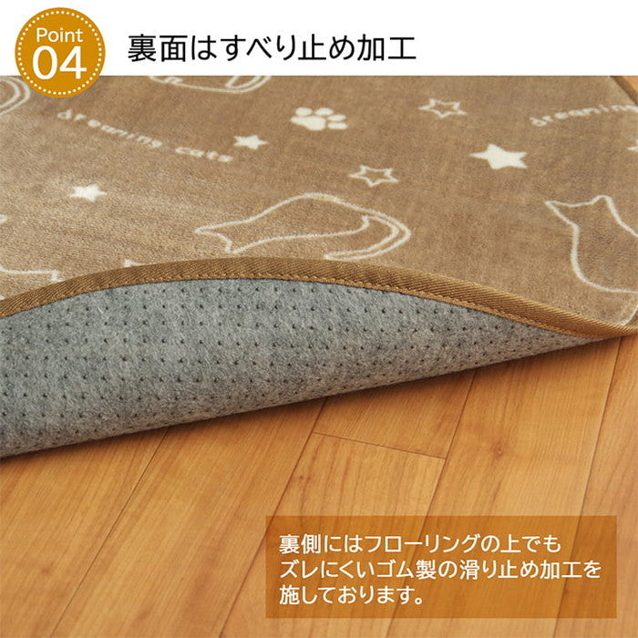 柔らかなフランネル素材で洗える楕円ラグ|かわいいネコ柄&抗菌防臭加工で快適ブラウン|ihk-1380000000465