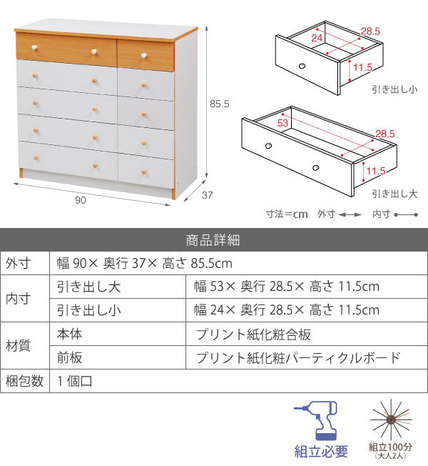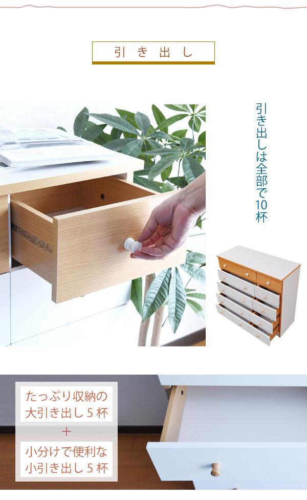 このチェストの最大の特徴は、大きめサイズの引き出しと小さめサイズの引き出しを組み合わせた5段構成です。幅53cm×奥行28.5cm×高さ11.5cmの大きい引き出しが3段、小さい引き出し(幅24cm×奥行28.5cm×高さ11.5cm)が2段あり、用途や収納物に合わせて使い分けが可能です。