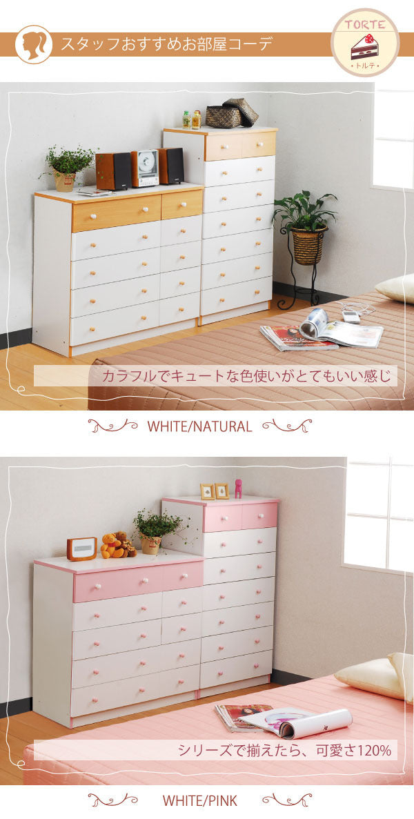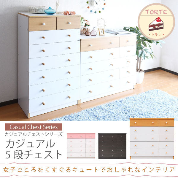 「家具インテリアのジェンコ(GENCO)」が提案するこのチェストは、ナチュラルで落ち着いた雰囲気を大切にしたデザインです。色展開はダークブラウン・ホワイトナチュラル・ホワイトピンクの3色から選べるので、お部屋のテイストに合わせてお選びいただけます。