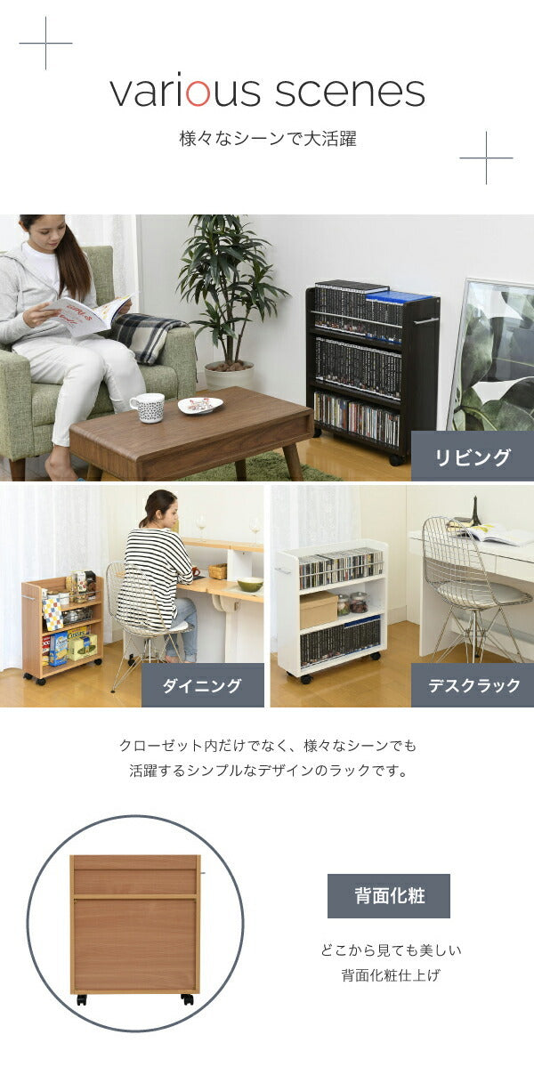 限られた空間を有効活用したい方には、「キャスター付きクローゼット収納ラック2個セット」が頼もしい味方になってくれます。スリムながらしっかりした作りで、多彩なメディアや小物類をまとめて整理できる点が魅力です。キャスター付きなのでお掃除や模様替え時も楽々移動可能。さらにカラーバリエーション豊富で、お部屋のスタ