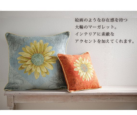 大胆ながらも繊細なマーガレット柄は、一つ置くだけで空間全体の印象を左右します。他アイテムとのコーディネートもしやすいカラーリングです。