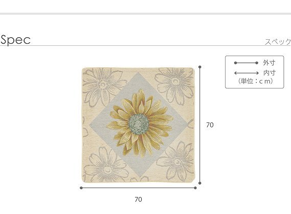 70×70cmという大判サイズはソファや床座にゆったり置けるちょうど良さがあります。小さいクッションと組み合わせることでバランス良く配置可能です。