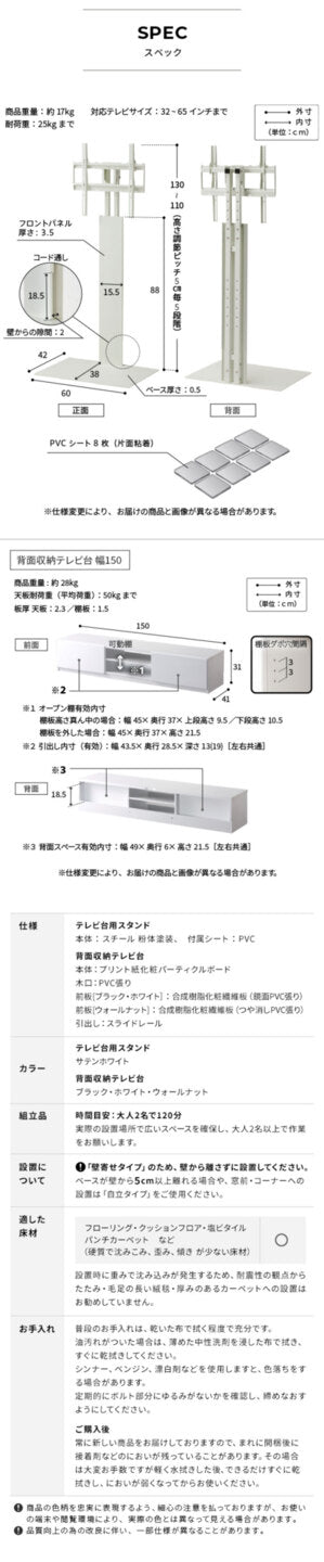 ご自宅のテレビサイズと重量(最大25kg相当)に合っているか必ずご確認ください。幅150cm対応なので一般的な大型テレビにも対応可能ですが、特別大きいサイズの場合は注意しましょう。