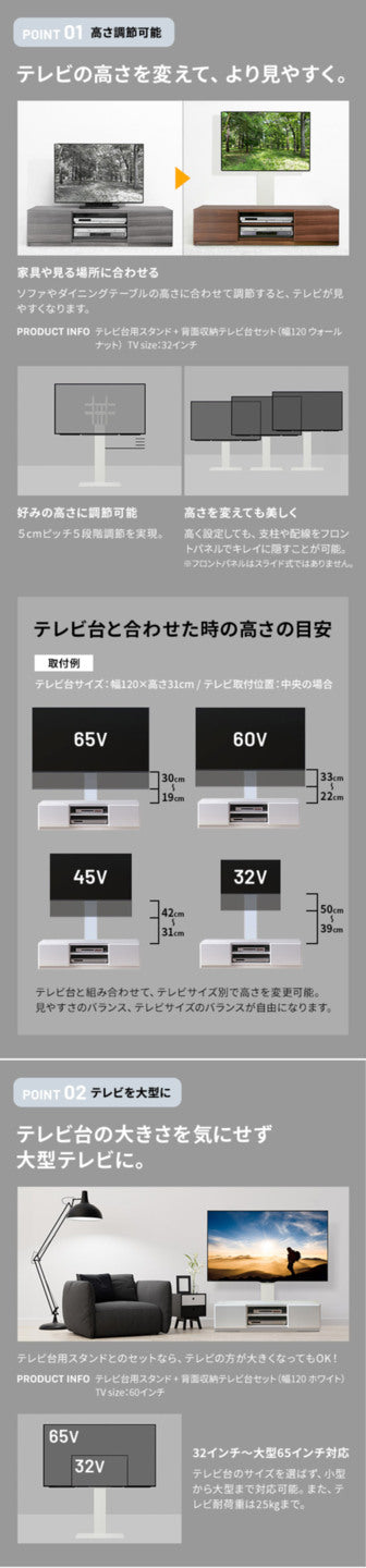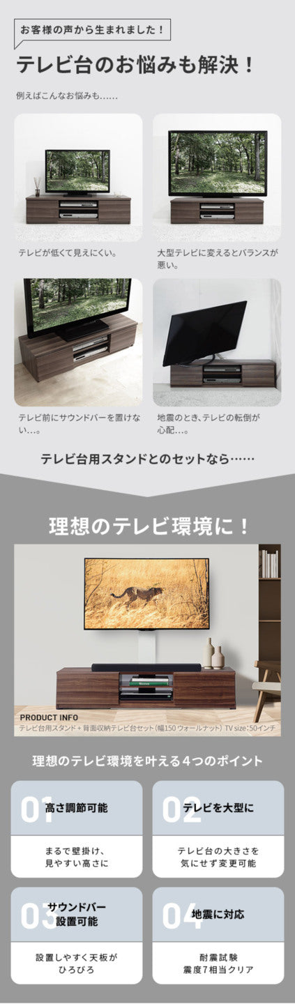 また、幅150cmのサイズは32インチから65インチまで対応可能なので、大画面テレビにも無理なく対応できます。これひとつで最新のテレビ環境を整えられる点も魅力です。