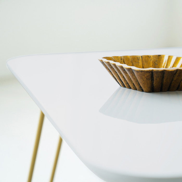 また天板は鏡面仕上げとなっており、光沢感が美しいだけでなく、置いた小物や飲み物をさりげなく映し出して空間にリズムを生んでくれます。鏡面加工は耐久性にも優れているため、日常使いによる傷や汚れにも強く、お手入れが簡単なのも嬉しいポイントです。