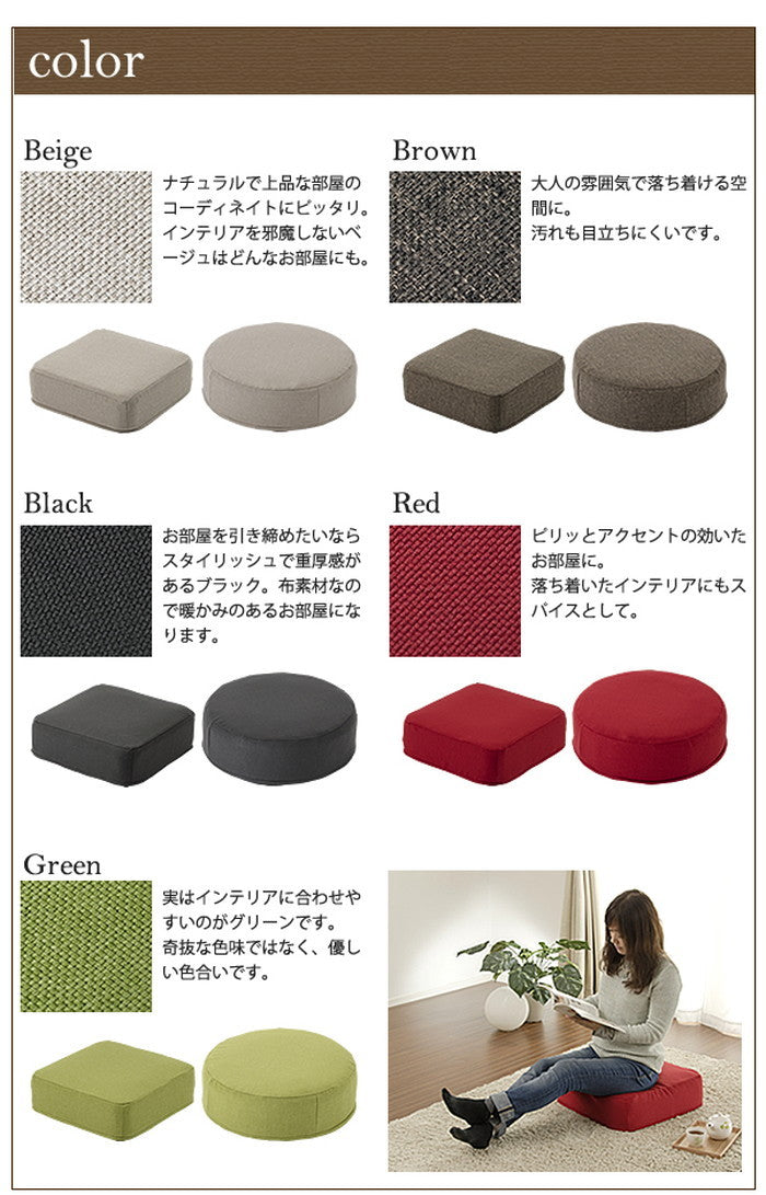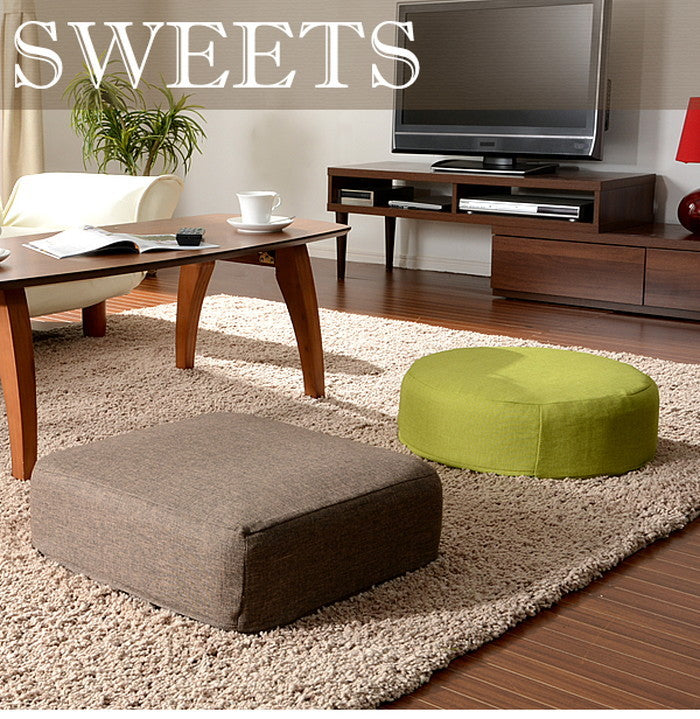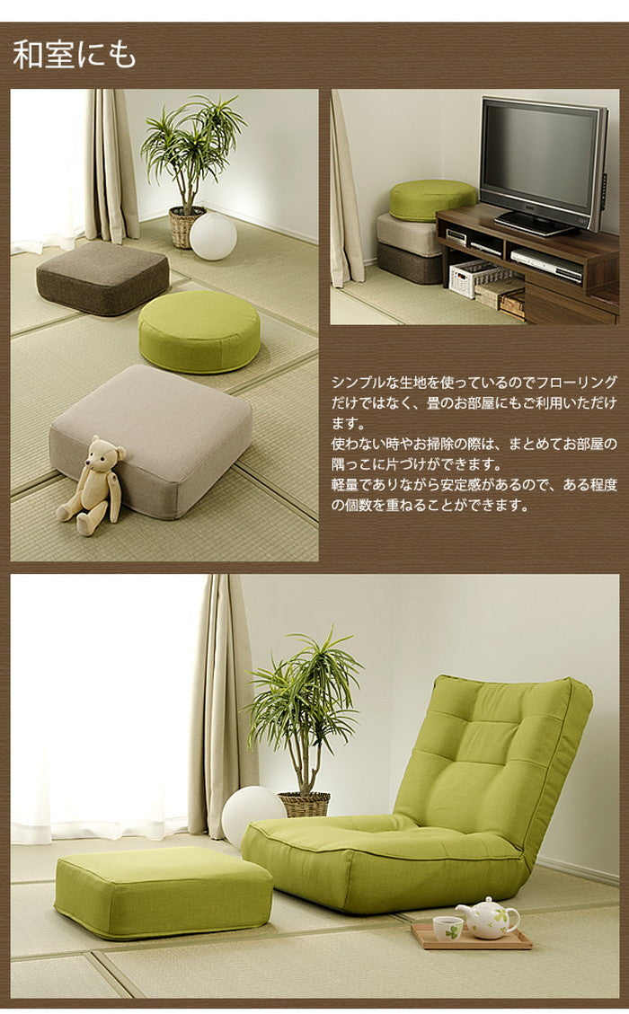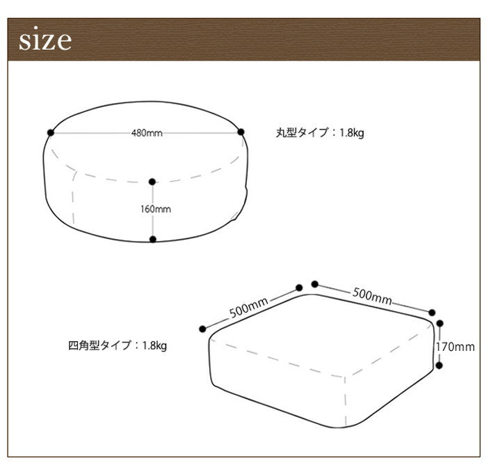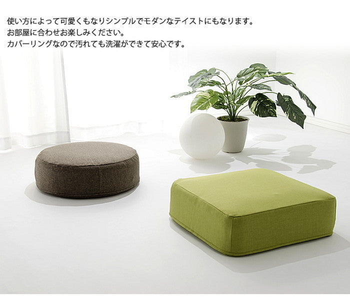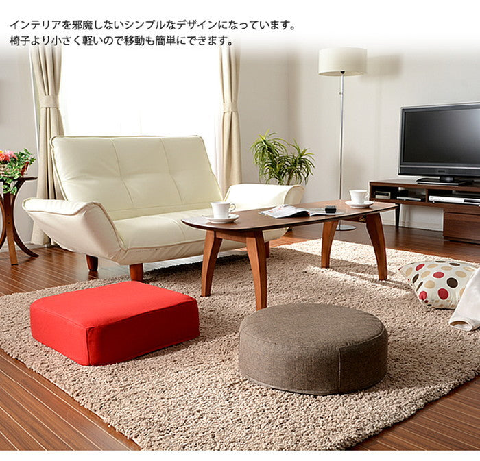 このシリーズは四角(スクエア)タイプと丸型(ラウンド)タイプの2種類をご用意しています。それぞれサイズは約480mm×480mm(高さ約170mm)、丸型は直径約480mm(高さ約160mm)で、どちらも座椅子やソファに合わせやすい絶妙な大きさです。
